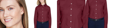 3.4 oz., 55% cotton, 45% polyester broadcloth; Fine yarn count shirting; True non-iron performance straight from the dryer; Stain release finish; true Non-iron performance straight from the dryera; Pearlized buttons; Patented pucker-free taped seams; Specially fused collar, cuffs and placket; Split back seam with bias cut back yoke; Straight collar; Sront and back princess seams for a feminine fit; Bust darts for a feminine fit;