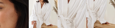100% heavyweight cotton terry. Two pockets. Tie front. Excellent absorbency qualities. Hanging loop.