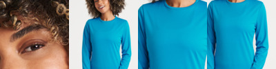100% polyester. Neoteric™ textured fabric with inherent wickability. UPF 30+ UV protection. Relaxed ladies fit. Self fabric collar. Taped neck. Twin needle stitching. Tear out label.