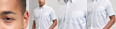 70% cotton/30% polyester. Easy care fabric. Semi-fitted styling. Wrinkle resistant finish. Button down collar. Left chest mitred pocket. Back yoke with two pleats. Curved hem. Easy cut out neck label. Available in long sleeve PR234.