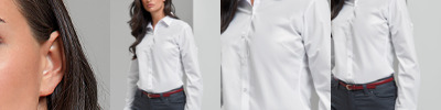 65% polyester/35% cotton poplin. Easy care fabric. Fitted style with bust and back darts. Soft collar styling. Two button cuffs. Curved hem. Cut out neck label. Available in short sleeve PR309.