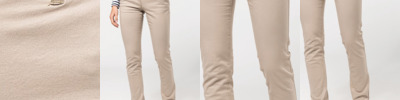 98% cotton twill/2% elastane. Enzyme washed fabric. Modern style. Flat front. Belt loops. Zip fly with button over. Two side pockets. Ticket pocket. Rear piped pockets.