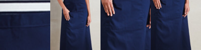 65% polyester/35% cotton twill. Easy care fabric. Long continental style. Single pocket combining pen pocket - tablet friendly. Self fabric 90cm ties. Width 90cm. Length 80cm. Industrial laundry 85°C. Domestic wash 60°C.