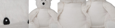 100% recycled polyester. Soft plush white polar bear. Contrast black nose. White panel on tummy. Suitable for vinyl print and sublimation.