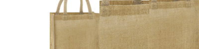 Unlaminated starched jute. Cotton carry handles (40cm long). Cut out label. Capacity 14 litres.