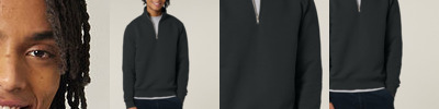Set-in sleeves. Self-fabric mock neck collar. Quarter-zip at the centre front. 1x1 rib at sleeve cuffs and bottom hem. Double-needle topstitches at the armhole, sleeve cuffs and bottom hem. Herringbone tape at the inside back neck and the inside of the zip. Self-fabric half moon at back neck.